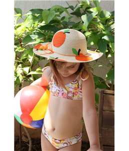 Biquíni infantil forrado na cor bege. Sutiãnzinho amarra nos ombros.