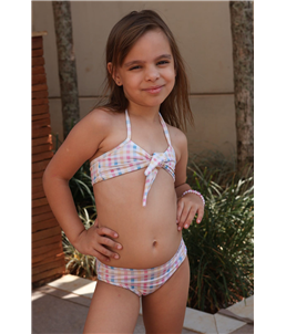 Biquíni infantil forrado na cor bege. Sutiãnzinho amarra na frente e no pescoço.